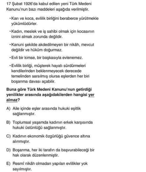 Buna göre “toplumsal yaşamda kadının erkek karşısında hukuki üstünlüğü sağlanmıştır” ifadesi (B şıkkı) kanunun yenilikleri arasında yer almaz.