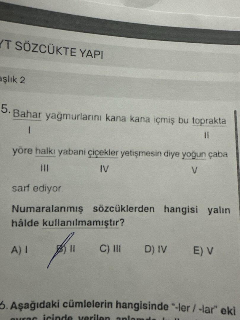 T SÖZCÜKTE YAPI aşlik 2 O. Bahar yağmurlarını kana kana içmiş bu toprakta yöre halkı yabani çiçekler yetişmesin diye yoğun çaba V IV sarf ediyor. Numaralanmiş sözcüklerden hangisi hâlde kullanılmamıştır? A) I C) IIl D) IV E) V 6. Aşağıdaki cümielerin hangisinde "ler / -lar eki rPo icinde verilon an yalın