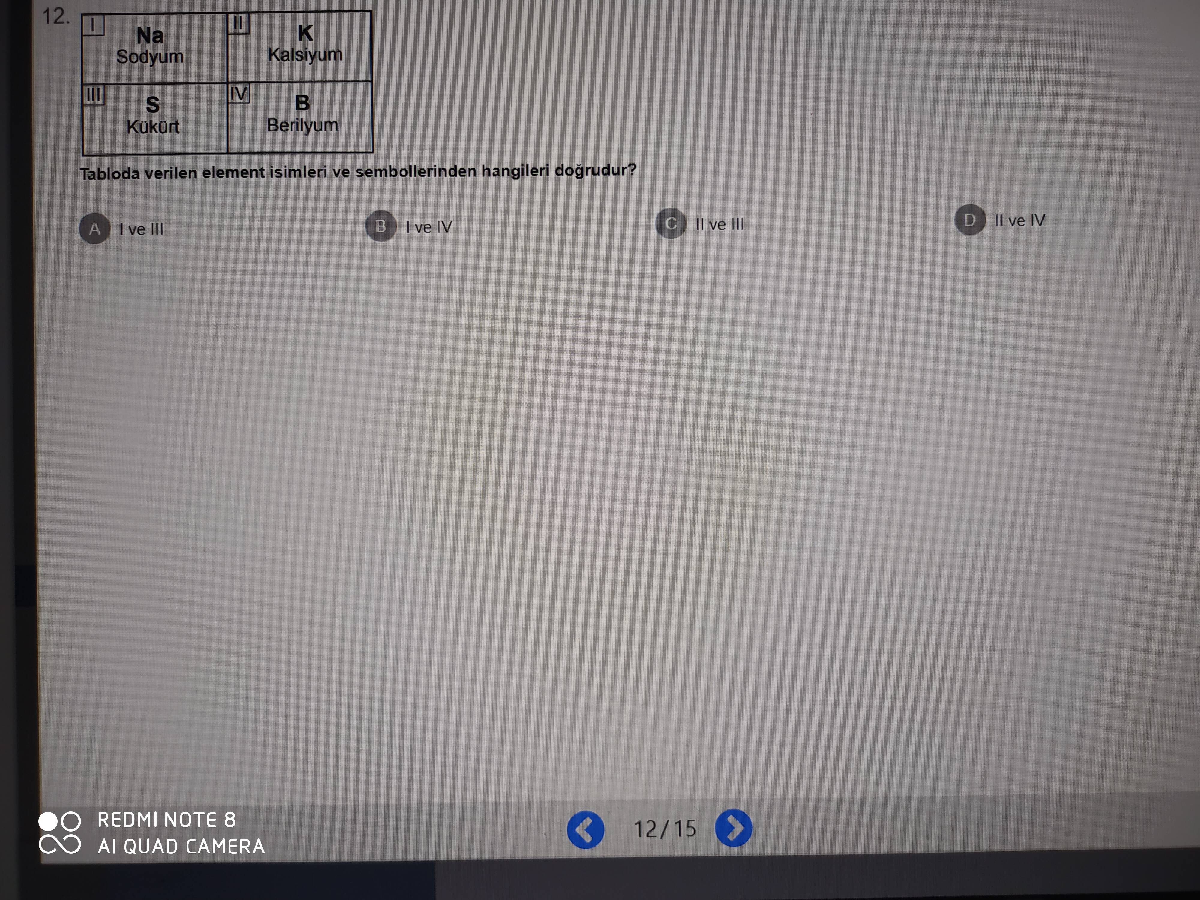 - II. K (Kalsiyum): Yanlış, sembol “Ca”.