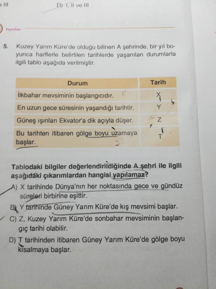 | D) | T tarihinden sonra Güney Yarım Küre’de gölge boyu kısalır | Soruda yapılamaz olarak verilmiş (anlam karışıklığı) |
