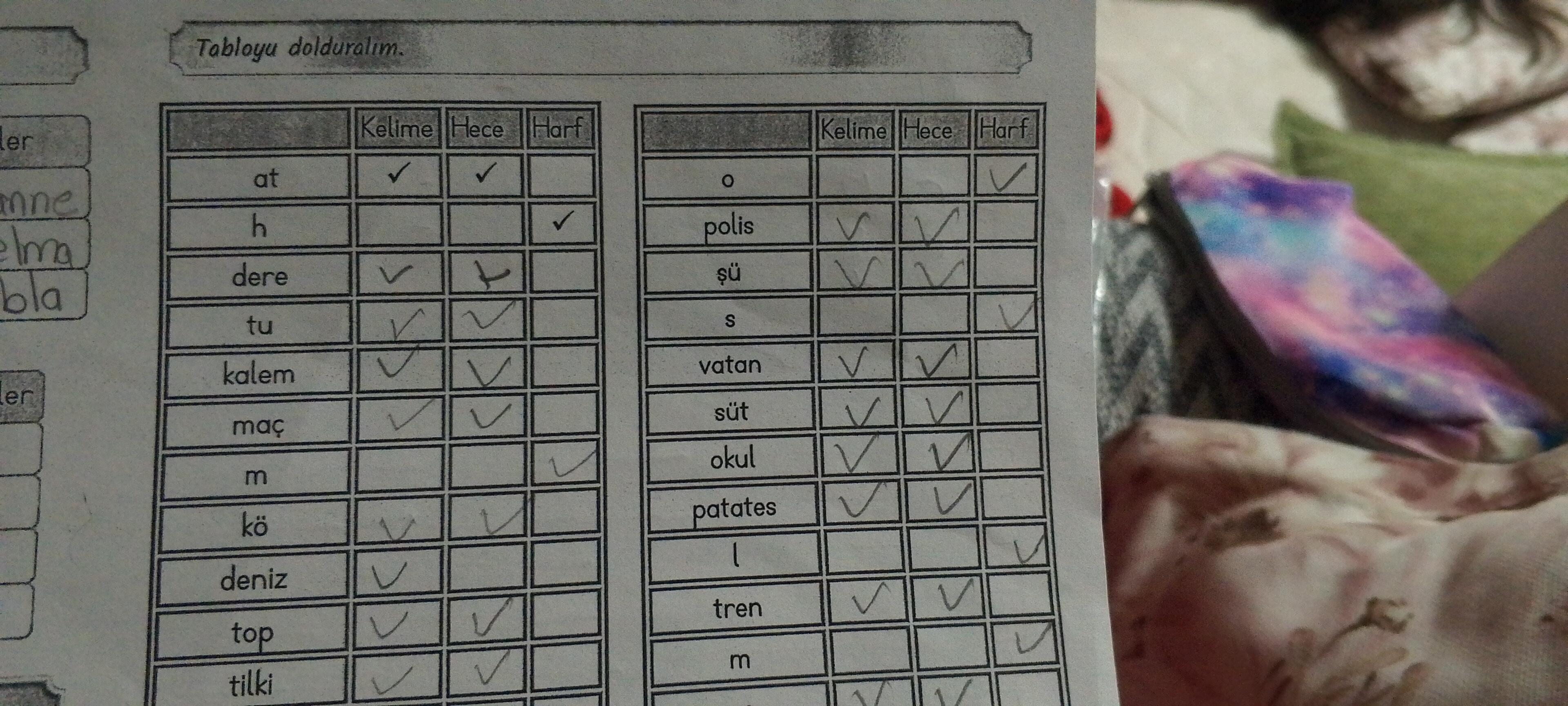 Aynı şekilde sağdaki kelimeler için de heceleri ve harfleri sayarak tablonun ilgili kısımlarına işaret koyabilirsiniz.