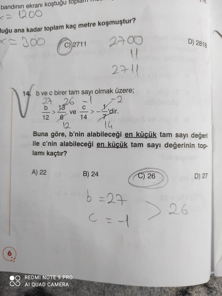 14) b ve c birer tam sayı olmak üzere; b/12 > 26/12 ve c/14 > -1/14 ise, b ve c’nin alabileceği en küçük tam sayı değerlerinin toplamı nedir?