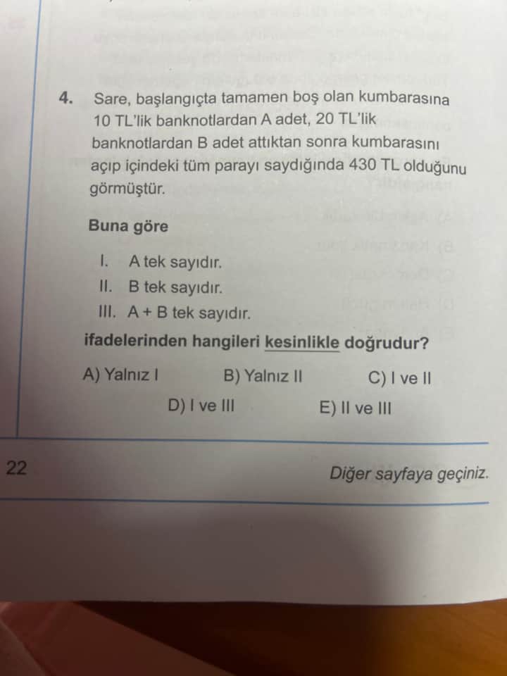 Soru: Sare, başlangıçta tamamen boş olan kumbarasına 10 TL’lik banknotlardan A adet, 20 TL’lik banknotlardan B adet attıktan sonra kumbarasını açıp içindeki tüm parayı saydığında 430 TL olduğunu görmüştür. Buna göre;