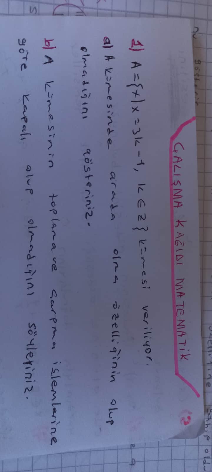 A kümesi ( A = { x \mid x = 3k - 1, , k \in \mathbb{Z} } ) olarak verilmiştir. Şimdi, bu kümenin toplama ve çarpma işlemlerine göre kapalı olup olmadığını inceleyelim.
