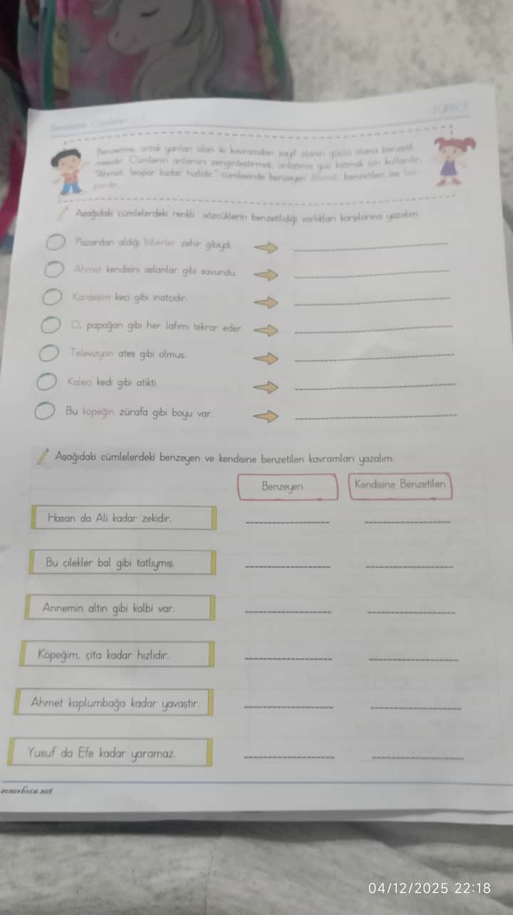 1. Aşağıdaki cümlelerdeki renkli sözcüklerin benzetildiği varlıklar