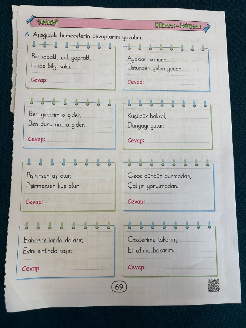 TURRGE A. Aşağıdaki bilmecelerin cevapların yazalım. Bir kapakl, cok yaprakl, lçinde bilgi sakl. Cevap: Ben giderim o gider, Ben dururum, o gider. Cevap: Pişirirsen aş olur, Pişirmezsen kus olur. Cevap: Bahçede krda dolaşır, Evini sırtında taşır. Cevap: Ayaklar su içer, Üstünden gelen geçer. Cevap: Küçücük bakkal, Dünyay yutar. Cevap: ilmeca Bunocs Gece gündüz durmadan, Calısır yorulmadan. Cevap: Gözlerime takarım, Etrafima bakarım. Cevap: