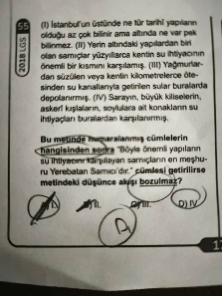 | II | Sarnıçların kentin su ihtiyacını karşıladığı | Akış bozulmaz, mantıklı devam eder. |
