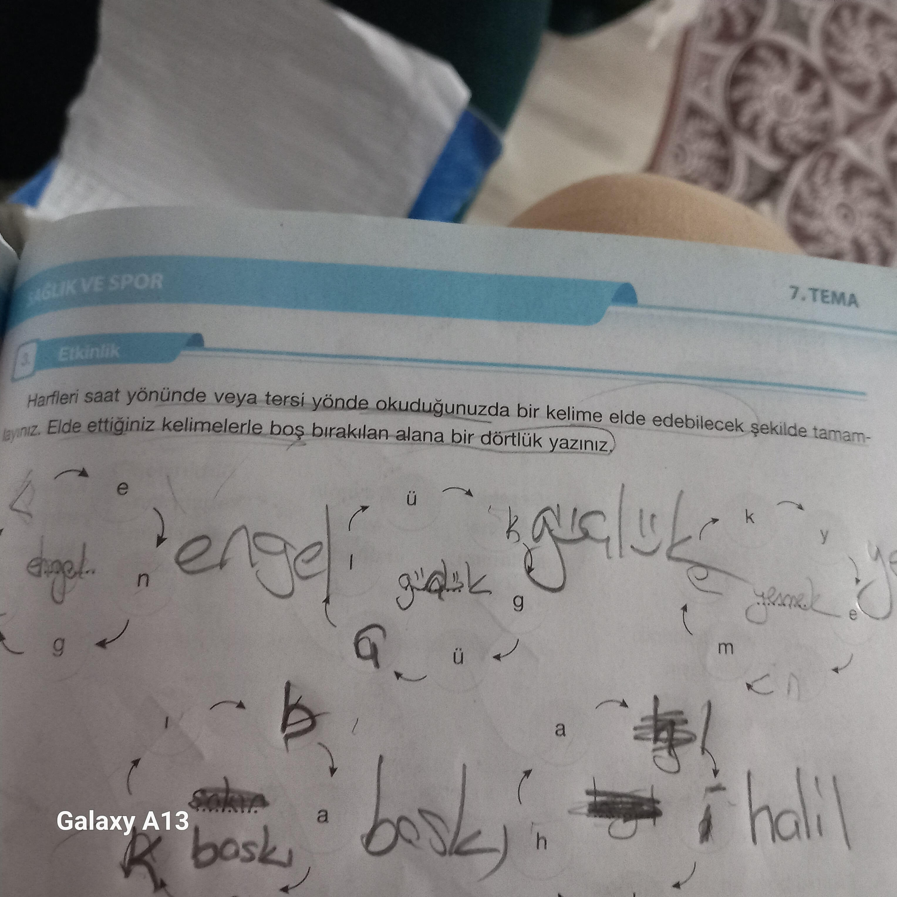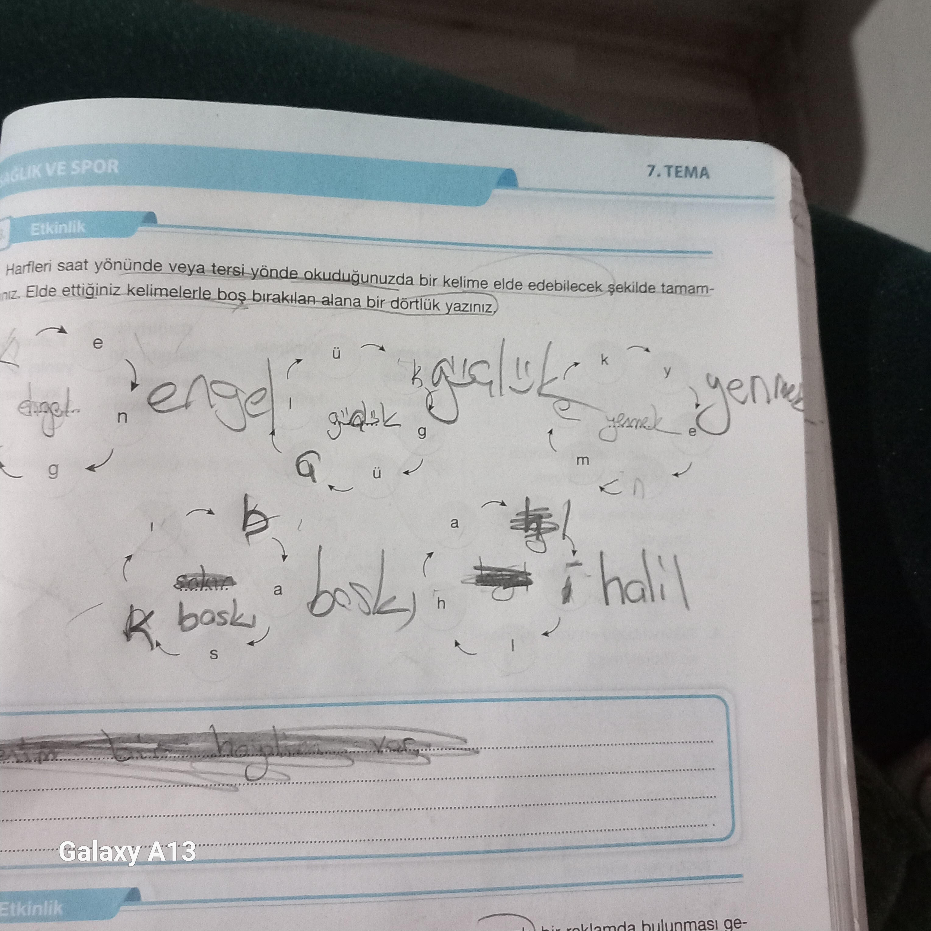 Fotoğrafta, hem bir bulmaca hem de bu bulmacadan çıkarılan kelimelerle bir dörtlük şiir yazılması isteniyor. Bulmacadan elde edilen anahtar kelimeler engel, güç, başarı, kaygı, yenmek, baskı, Halil gibi kelimeler. Konu, sağlık ve spor bağlamında “engel ve zorlukları aşmak, başarıya ulaşmak”.