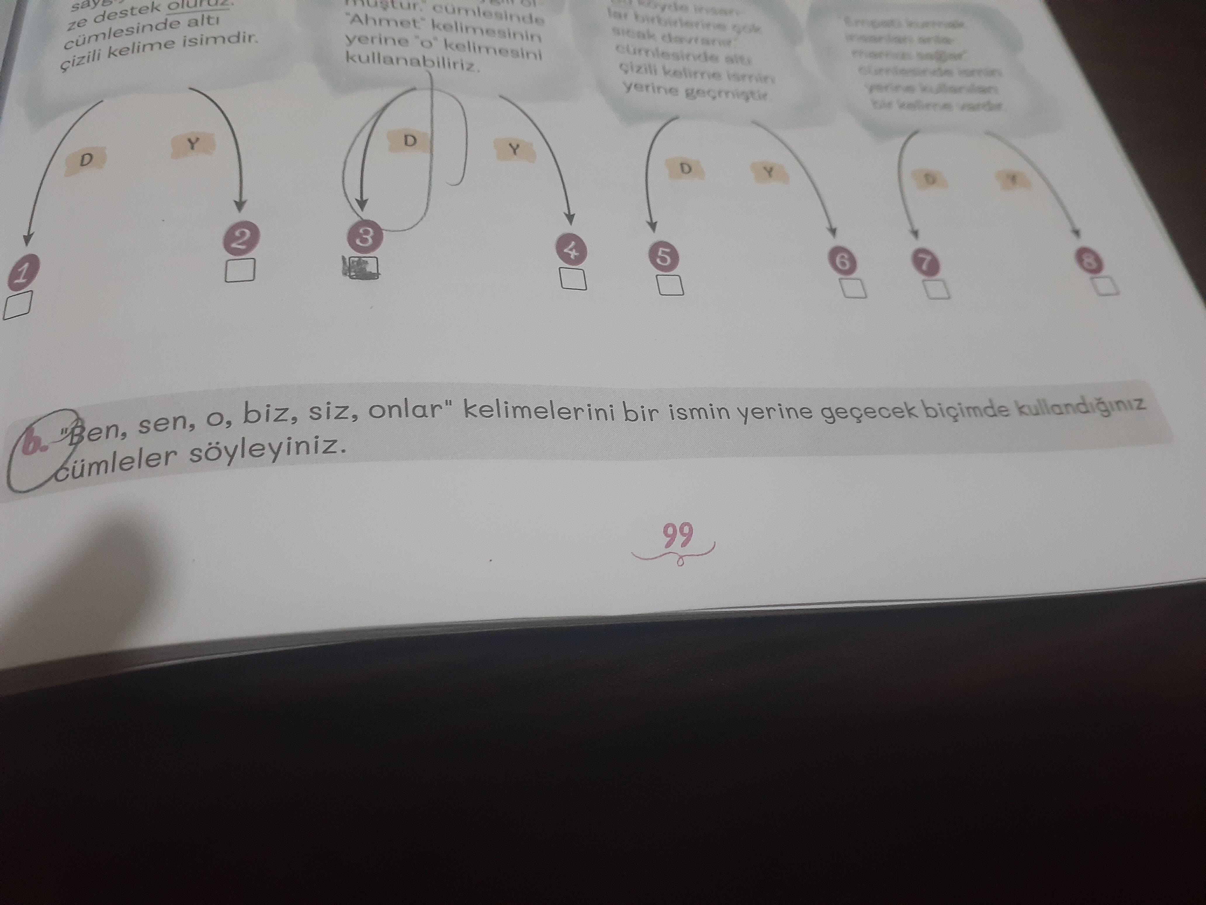 “Ben, sen, o, biz, siz, onlar” kelimelerini birinin yerine geçecek biçimde kullanıldığı cümleler söyleyiniz.