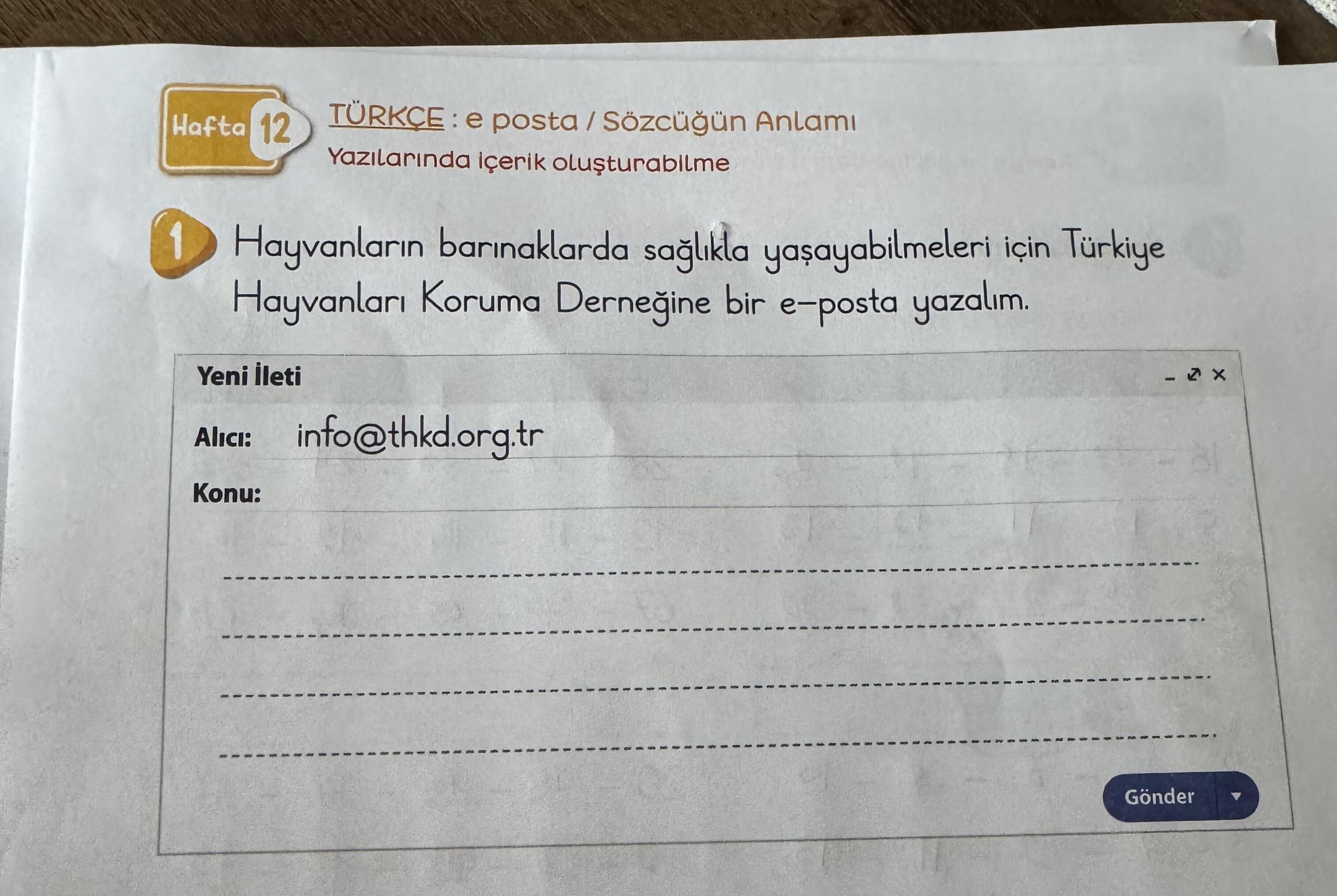 “Hayvanların barınaklarda sağlıklı yaşayabilmeleri için Türkiye Hayvanları Koruma Derneğine bir e-posta yazalım.”