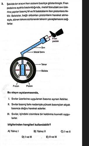 Problemde, bir aracın fren sistemi sıvı ve pistondan oluşan bir mekanizma ile açıklanıyor. Burada, hangi fiziksel ilkelerin bu mekanizma için geçerli olduğunu anlamamız isteniyor.