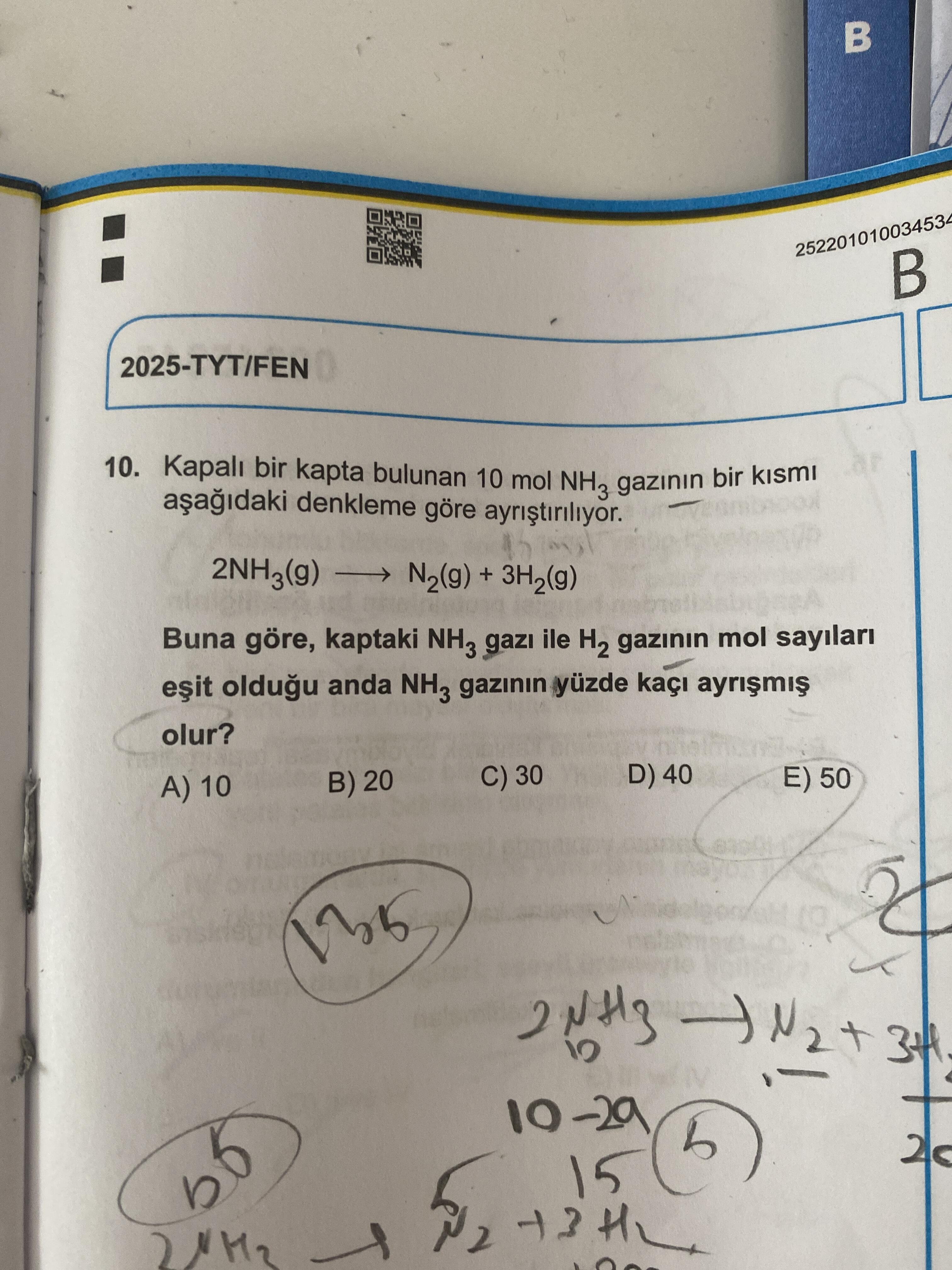 Ayrışan NH₃ miktarı = 4 mol → Bu, başlangıçtaki 10 mol’ün 4 mol’üdür.