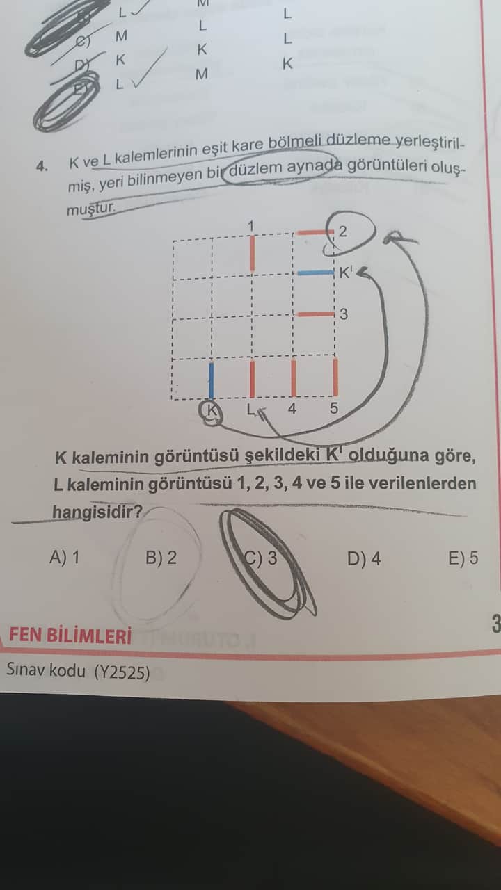Soru: K ve L kalemlerinin eşit kare bölmeli düzleme yerleştirilmiş, yeri bilinmeyen bir düzlem aynada görüntüleri oluşmuş. K kaleminin görüntüsü şekildeki K’ olduğuna göre, L kaleminin görüntüsü 1, 2, 3, 4 ve 5 ile verilenlerden hangisidir?