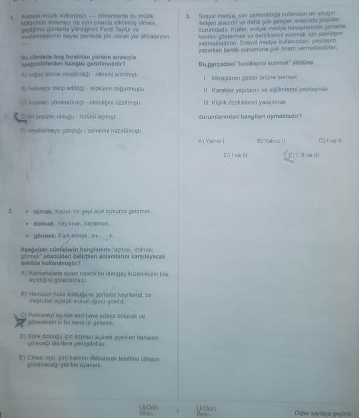 - Arabesk Müzik Sorusu (Soru 1): Metne en iyi uyum sağlayan seçenek D’dir; “en popüler olduğu – önünü açmıştı.”