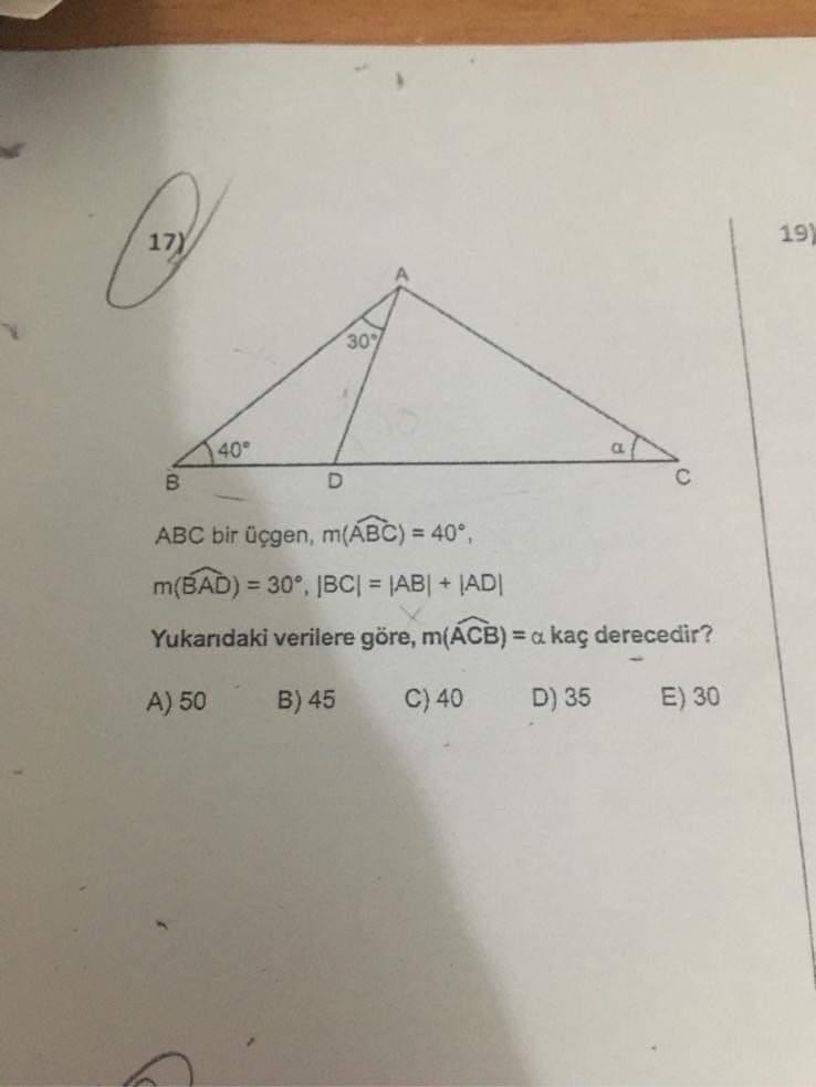 ABC bir üçgen, m(ABC) = 40°, m(BAD) = 30°, [BC] = |AB| + |AD]