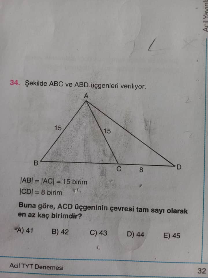 Soru: Şekilde ABC ve ABD üçgenleri veriliyor. |AB| = |AC| = 15 birim, |CD| = 8 birim. Buna göre, ACD üçgeninin çevresi tam sayı olarak en az kaç birimdir?