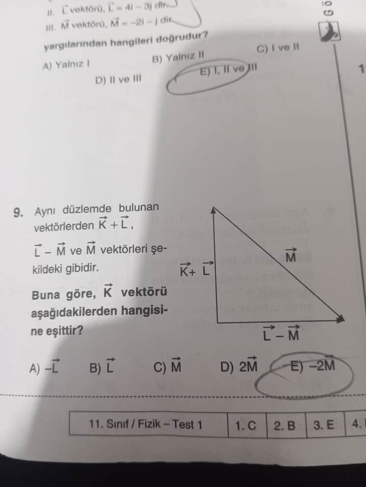 Bu soruda, şekil üzerinde verilen vektörlerin uç-uca eklenmesiyle ve matematiksel çözümünün sonunda, \vec{K} vektörü seçenekler arasında yalnızca -2\vec{M}'ye eşit olabilir.