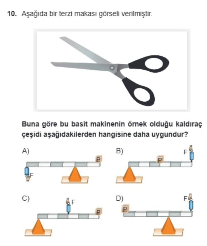 Terzi makası, fulkrum (mafsal) ile kuvvet (F) ile yük (P) arasında kalan bir düzenek olduğundan 1. tür kaldıraç örneğidir — doğru seçenek A.