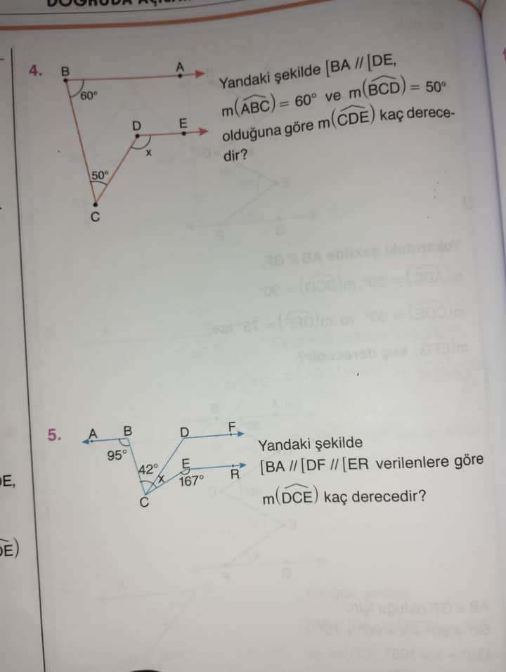 | 5 | BA ∥ DF ∥ ER | 95°, 42°, 167° (şekilde gösterilmiş) | m(∠DCE) | Paralel doğrular üstünde oluşan iç ters/yöndeş açılar + 180°/360° ilişkileri | 48° (yaygın) |