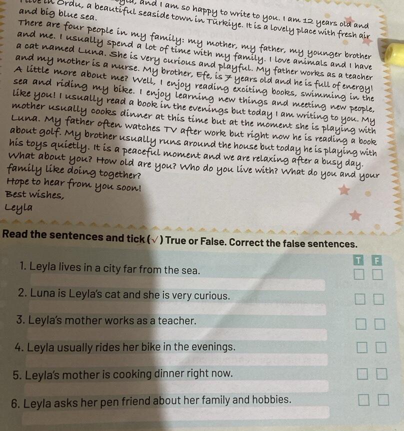 y,ama t am So happy to write to you. I am 12 years old and L0 LW Ordu, a beautiful seaside town i Türlkiye. It is a Lovely tis a Lovely place witth fresh air There are four people Ln my family: my mother, mu father, my younger brotheY anad me. Isually spend a Lot of time with mu family. I Love animals and have a cat amed una. she is very curious and pLauful. My father works as a teacher and my mother is a nurse. My brother, Efe, is y years old and he is full of eneroy! A Luttle more about e? weL, I eníoy readina exoiting books, swiming in the sea anal rudin9 myy bike. I enjoy Learing new things and mectung new people, Like you! I wsually read a book in the evenings but todayI am writing to you. My mother usualy cooks dinner at this time but at the moment she is playng with Luna. My tather ofte watches TV after work but right now he is reading a book about golt. My brother usually runs arond the house but today he is playing with his toys quietly- It is a peaceful moment and we are relaxing after a busy day. What about you? How old are you? who do you live with? What do you and your family Like doing together and big blue sea. Hope to hear from you soon! Best wishes, Leyla Read the sentences and tick ) True or False. Correct the false sentences. 1. Leyla lives in a city far from the sea. 2. Luna is Leyla’s cat and she is very curious. 3. Leyla’s mother works as a teacher. 4. Leyla usually rides her bike in the evenings. 5. Leyla’s mother is cooking dinner right now. 6. Leyla asks her pen friend about her family and hobbies. F
