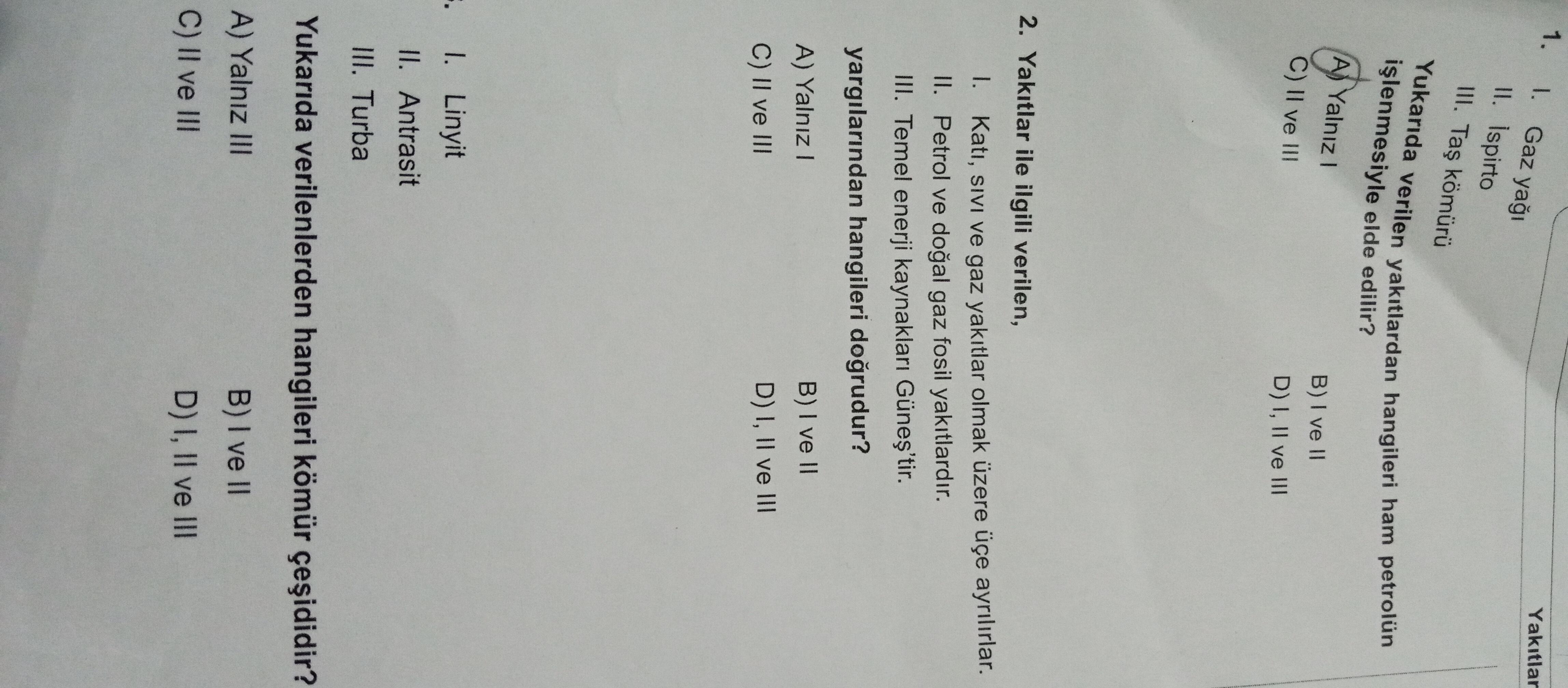 | I. Katı, sıvı ve gaz yakıtlar olmak üzere üçe ayrılırlar. | DOĞRU | Yakıtlar, fiziksel hâline göre katı (kömür, odun), sıvı (benzin, mazot) ve gaz (doğal gaz, biyogaz) olmak üzere üç temel gruba ayrılır. |