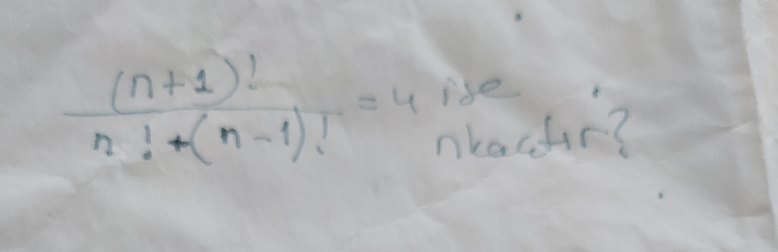 \frac{(n+1)!}{n! + (n-1)!} = n.Denklemin 4’e eşit olması için n = 4 olmalıdır.
