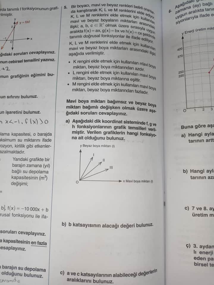 Soru 5: Mavi boya miktarı bağımsız, beyaz boya miktarı bağımlı değişken kabul edilmiştir. Grafikte I, II, III şeklinde verilen doğru parçaları hangi fonksiyona aittir? b katsayısını bulunuz. a ve c katsayılarının alabileceği aralıkları bulunuz.