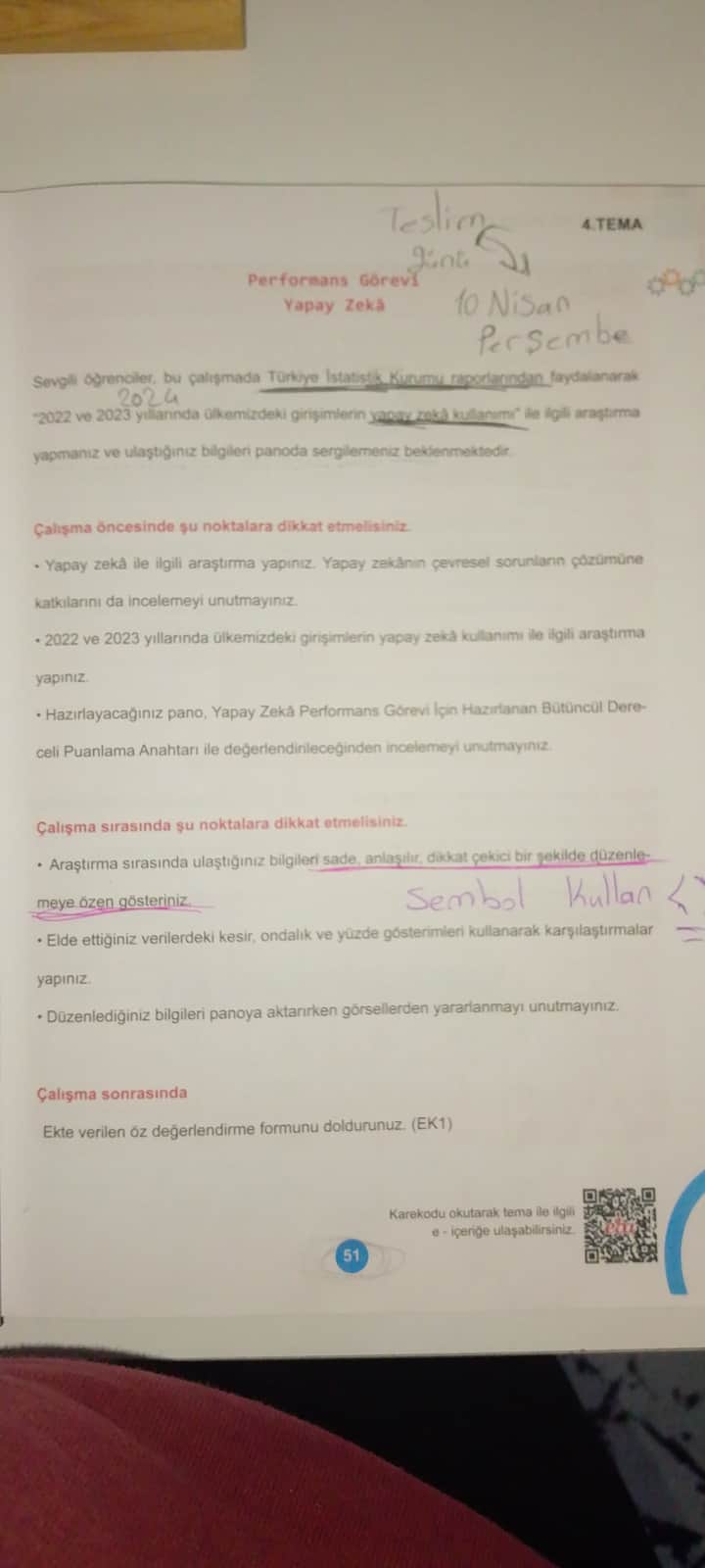 Merhaba sevgili öğrenciler! Bu performans görevi kapsamında, Türkiye İstatistik Kurumu (TÜİK) raporlarından, çeşitli araştırma kuruluşlarının verilerinden ve güncel medya kaynaklarından yararlanarak 2022 ve 2023 yıllarında ülkemizdeki girişimlerin yapay zekâ kullanımını incelemeniz beklenmektedir. Ayrıca yapay zekânın çevresel sorunların çözümüne katkılarını araştırmalı, elde ettiğiniz verileri sade, anlaşılır ve dikkat çekici bir biçimde düzenlemelisiniz. Son olarak, çalışmalarınızı bir pano üzerinde sunmalı ve verilen öz değerlendirme formunu (EK1) doldurmalısınız.