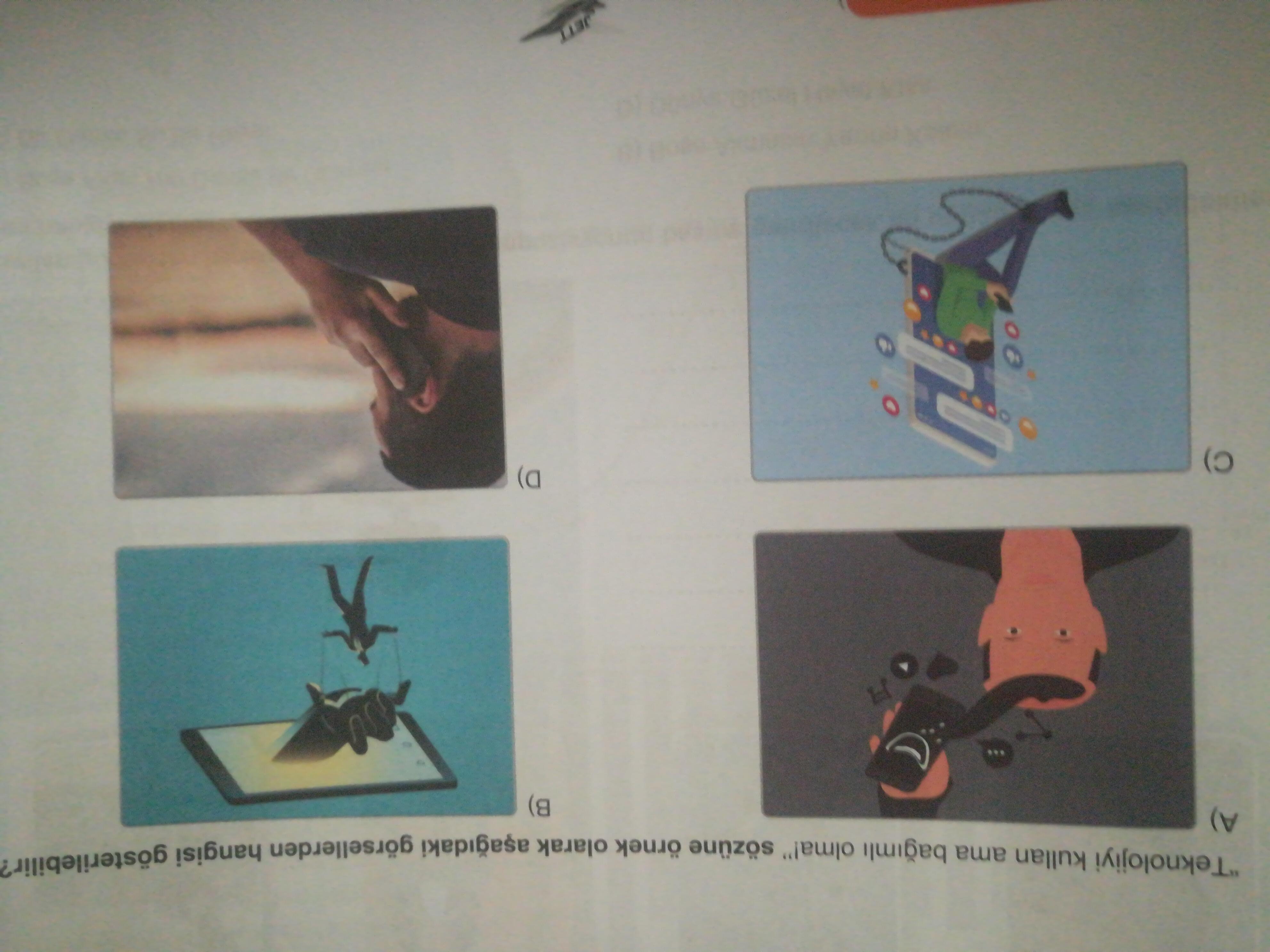 • Öncelikle sanatçı veya tasarımcı, vermek istediği mesaja uygun bir tema belirler. Burada görüldüğü üzere tema, “akıllı telefon ve sosyal medyanın birey üzerindeki olumsuz etkileri” olabilir.