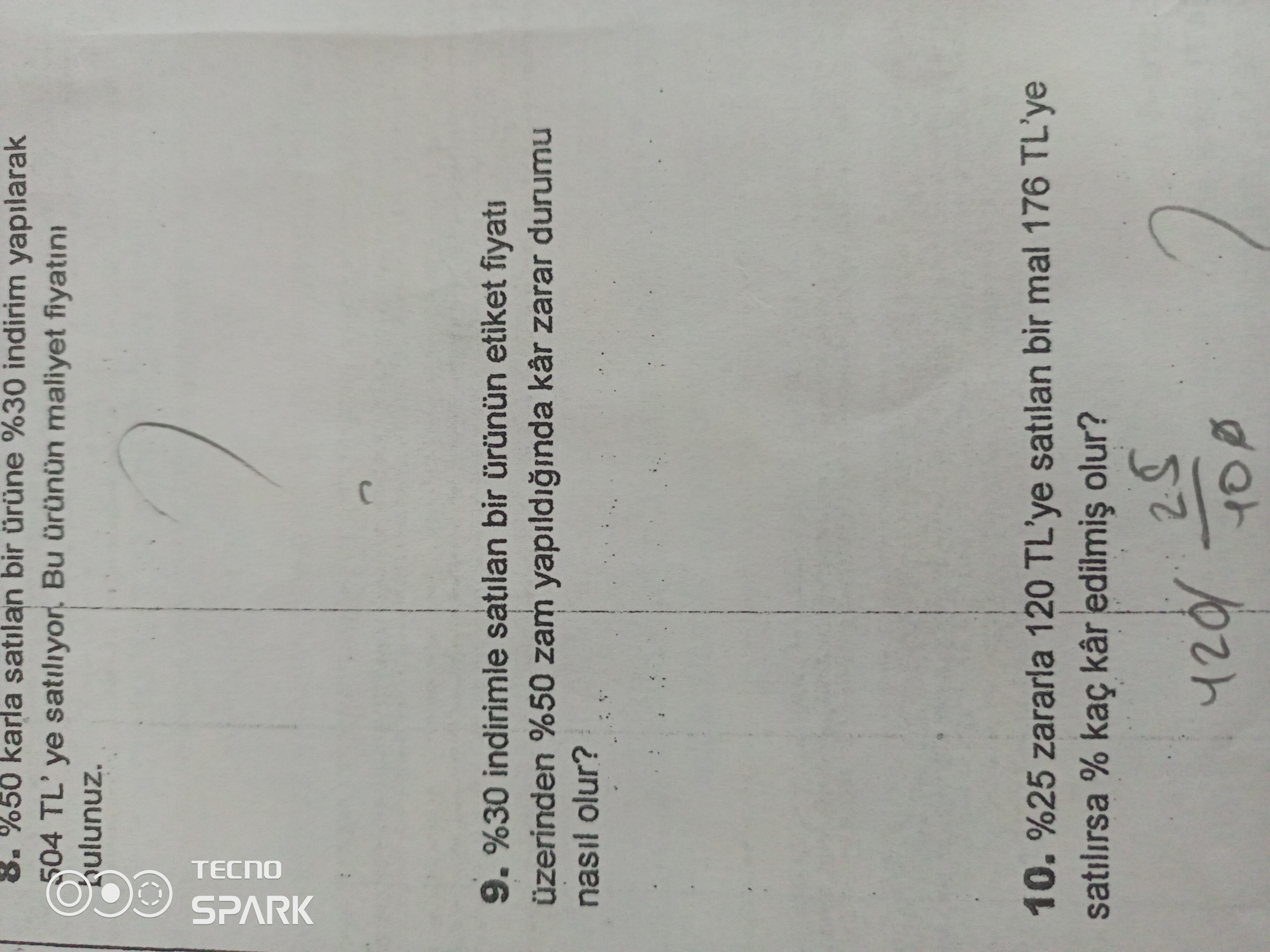 | 10 | 25 zararla 120 TL’ye satılan bir mal 176 TL’ye satılırsa kaç kâr edilir? | %25 zarar → M=160 TL. Yeni satış 176 TL → Kâr=16/160= %10 | %10 kâr |