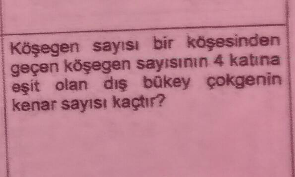 “Köşegen sayısı bir köşesinden geçen köşegen sayısının 4 katına eşit olan dış bükey çokgenin kenar sayısı kaçtır?”