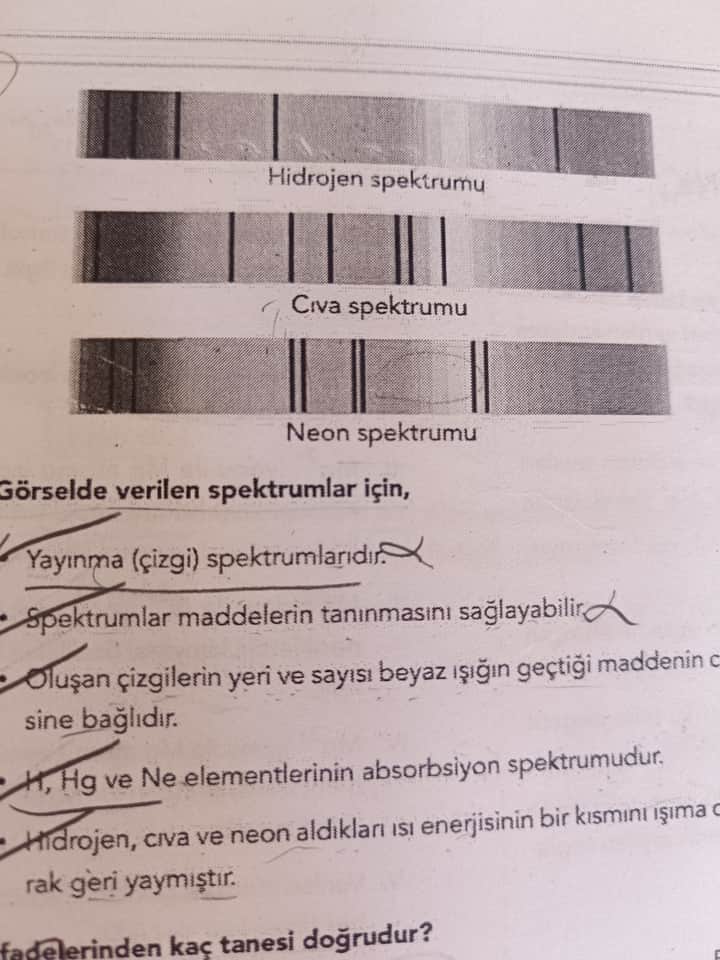 - Yanlış. Görseldeki spektrumlar yayınım spektrumudur, absorbsiyon spektrumu değil. Absorbsiyon spektrumu, beyaz ışığın bir madde tarafından emilmesi ile elde edilen spektrumdur.