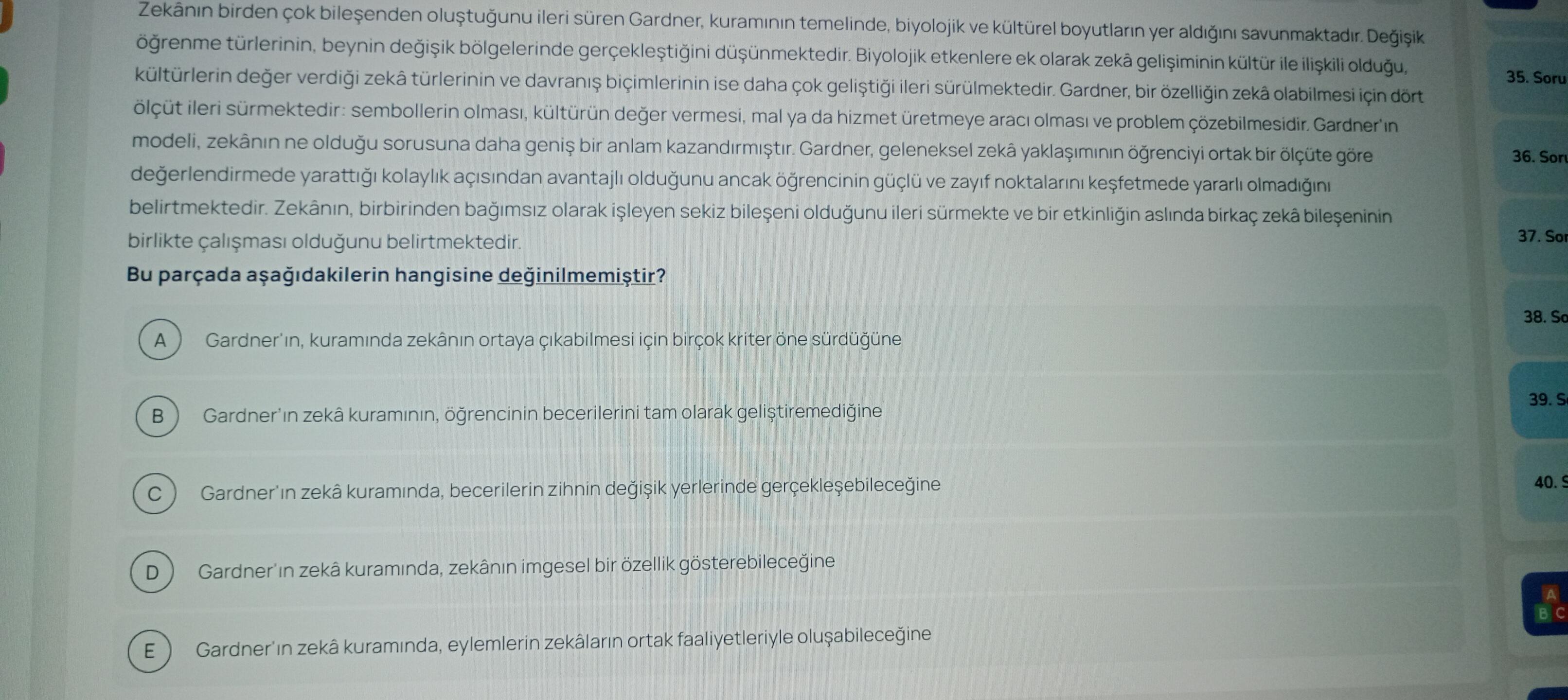 Cevap: Gardner’ın zeka türleri ve bölgelerle ilişkilendiği parçada yer almıştır. Bu seçenek doğru değildir. -