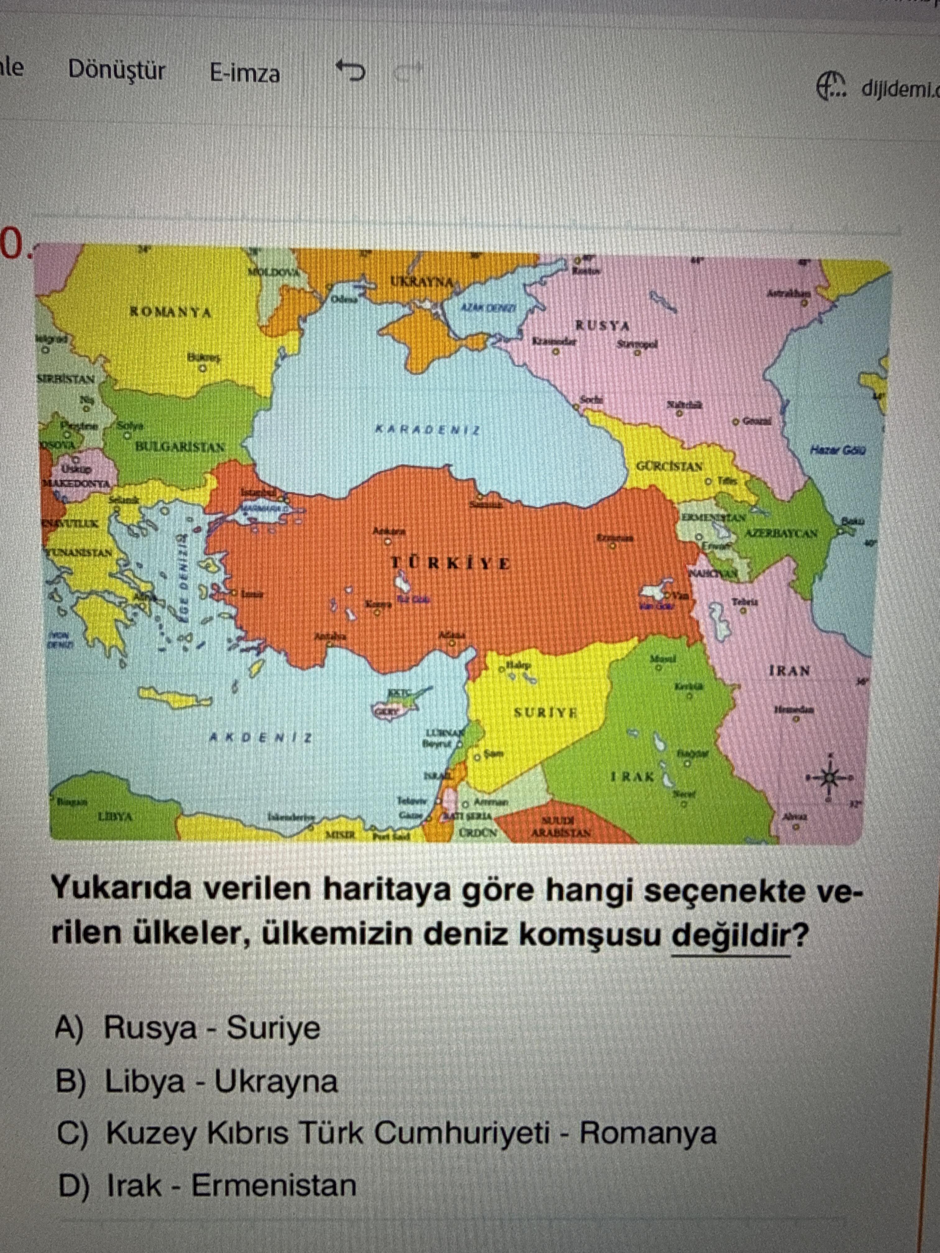 Soru: Yukarıdaki haritaya göre verilen ülkelerden hangisi Türkiye’nin deniz komşusu değildir?