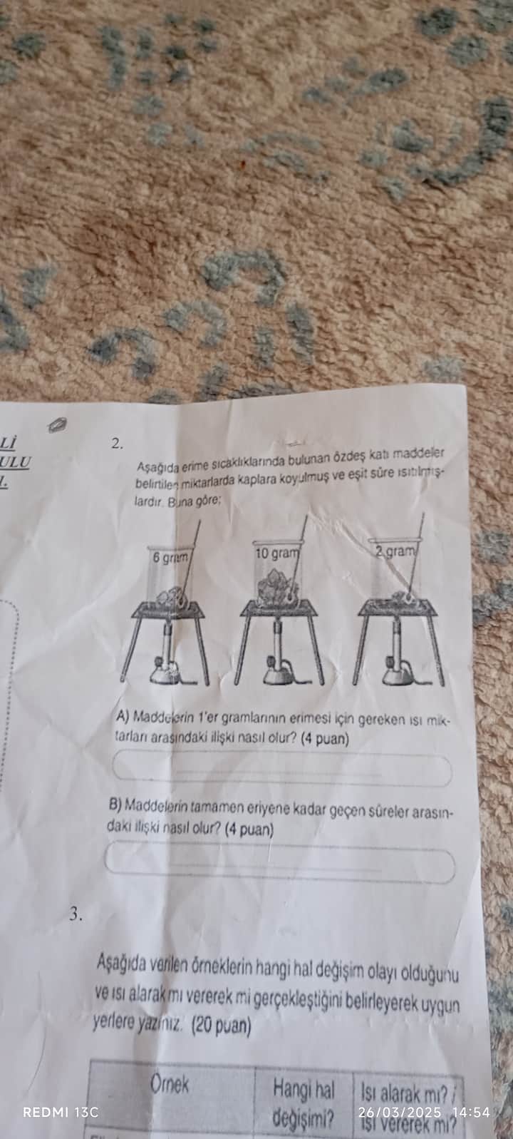 Aşağıda erime sıcaklıklarında bulunan özdeş katı maddeler belirli miktarlarda (6 g, 10 g ve 2 g) kaplara koyulmuş ve eşit süre ısıtılmışlardır. Sorular: