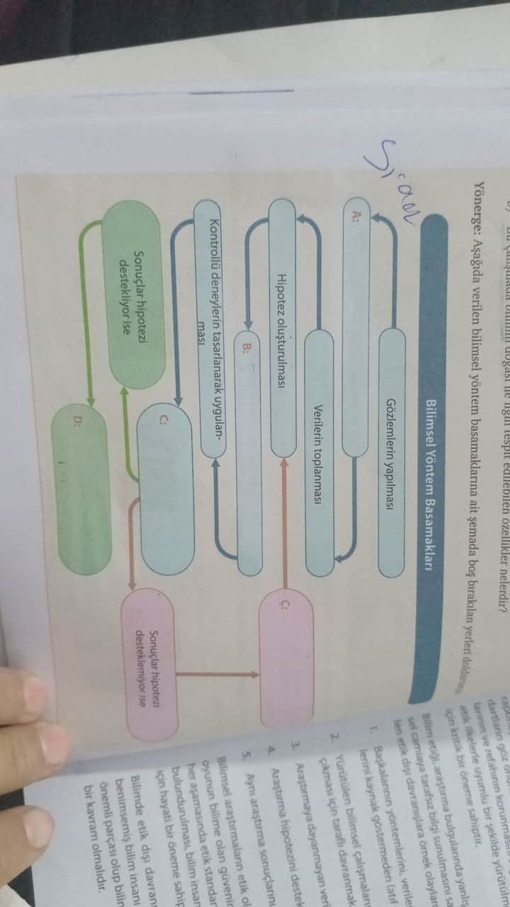Soru: Aşağıda verilen bilimsel yöntem basamaklarına ait şemada boş bırakılan A, B, C ve D noktalarına sırasıyla hangi ifadeler getirilmelidir?