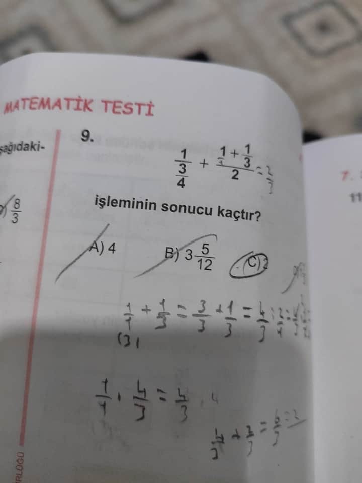 Sorunun şıklarında \frac{3}{4} yok. Fotoğraftaki işaretli cevap C seçeneğinde 2 olarak işaretlenmiş ama matematiksel olarak yukarıdaki işlemler sonucu \frac{3}{4} bulunmuştur. Eğer soruda ya da kitapta bir baskı hatası yoksa, bu cevap doğrudur.