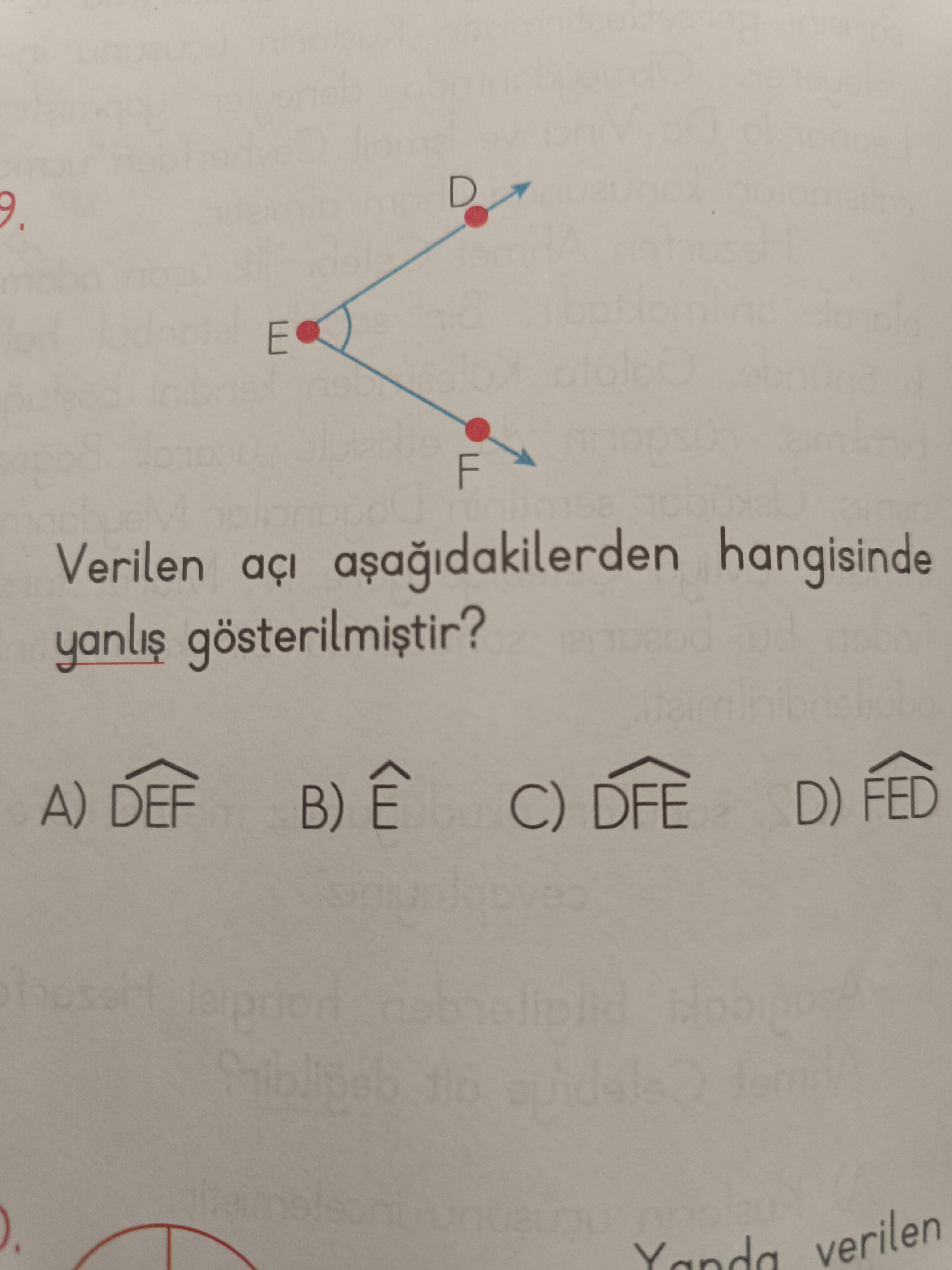 Bu nedenle, C) ∠DFE verilen açı için yanlış gösterimdir.